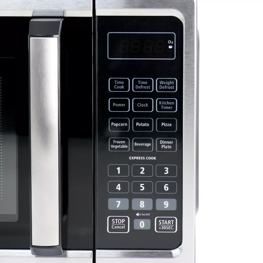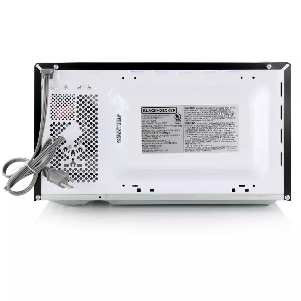 This professional-style Black + Decker 0.9 Cubic Foot 900 Watt Stainless Steel Microwave features 10 power levels, removable glass turntable and a spacious interior. Optimally cook or reheat six of the most popular food items with the touch of a button. Choose power levels up to 900 watts. The large LED digital display has a clock function and can also display a countdown timer as well as the cooking time remaining. Easily open the microwave with the push-button.
