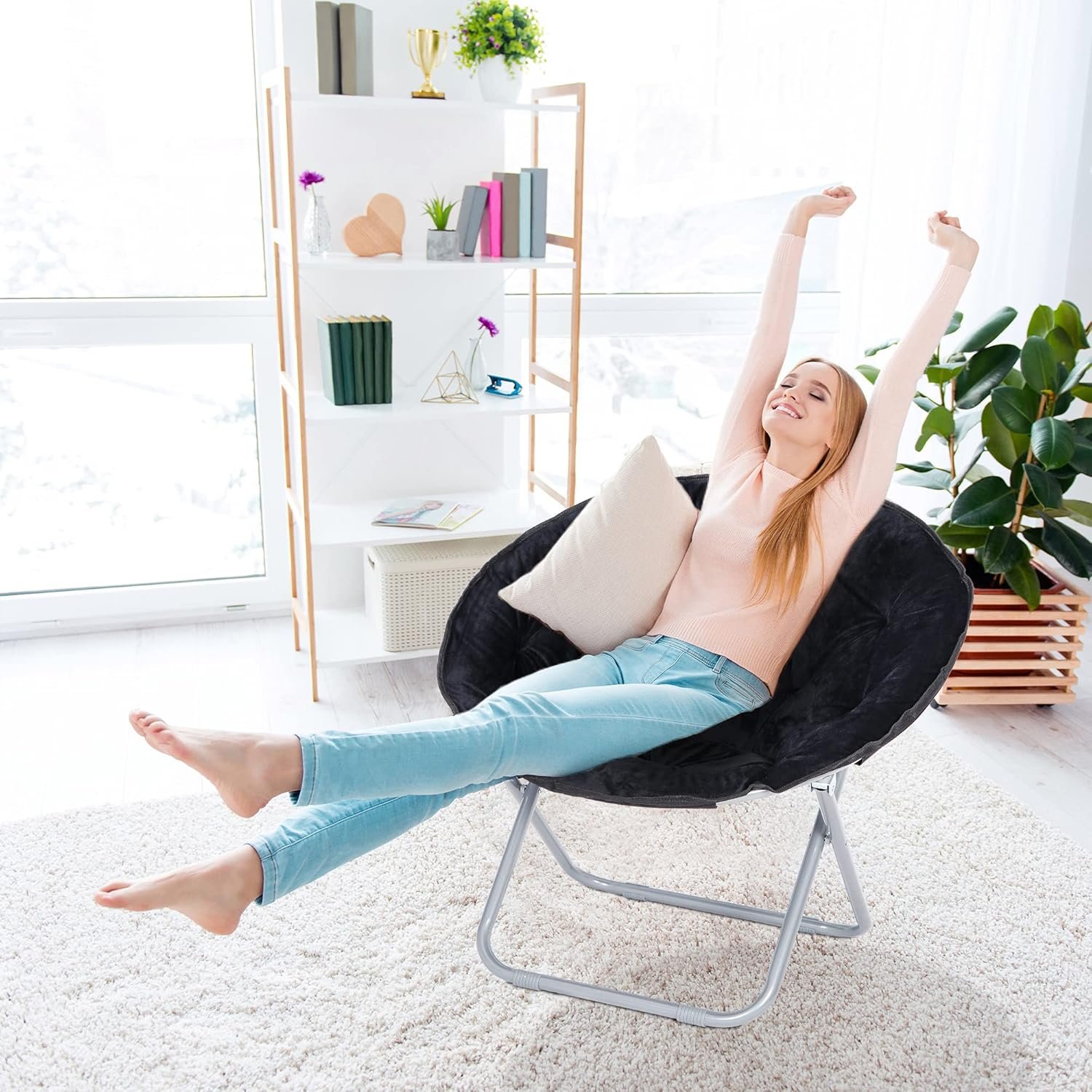 The chair is made of comfortable cushions and heavy metal base, which is not only soft and comfortable, but also strong and durable. This moon chair is very suitable for reading, watching TV, playing games or relaxing. It is the perfect choice for dormitory, study, game room, bedroom, balcony and other places. You can even let your pet play and rest on it.